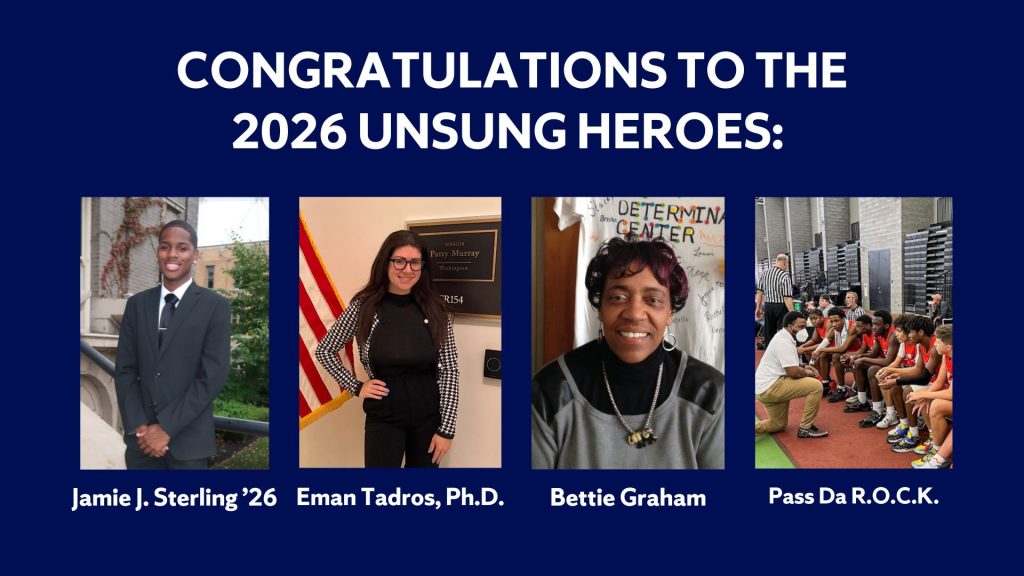 The 41st Annual Rev. Dr. Martin Luther King Jr. Celebration Planning Committee has announced the 2026 Unsung Hero Award winners: Jamie Sterling ’26, Eman Tadros, Pass Da R.O.C.K and Bettie Graham.