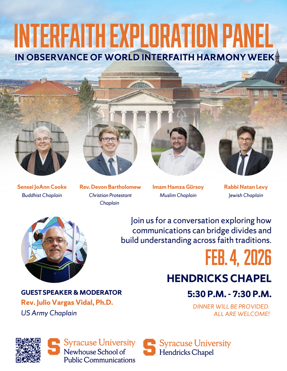 Hendricks Chapel of Syracuse University is celebrating religious and spiritual diversity and inclusion through Interfaith Exploration Week from Feb. 1-6, 2026. All students, faculty, and staff are invited to participate in a series of gatherings that provide an opportunity to learn about diverse religious and spiritual traditions, rediscover familiar traditions, and build relationships and understanding across barriers. Hosted by the Chaplains of Hendricks Chapel, participants can attend Jumuah prayer, a Buddhist meditation, Catholic Mass, Shabbat dinner and more.